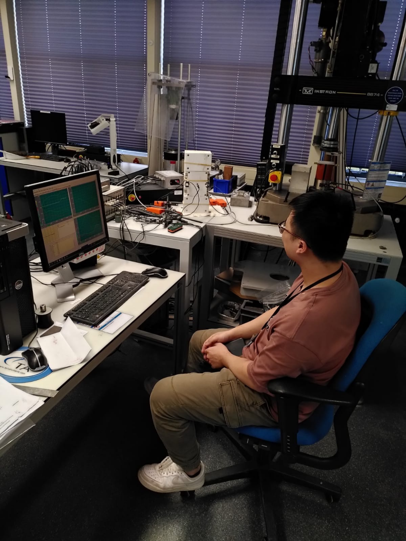 Minfei is watching the shrinkage of his dogbone-shaped concrete in the new TSTM setup.